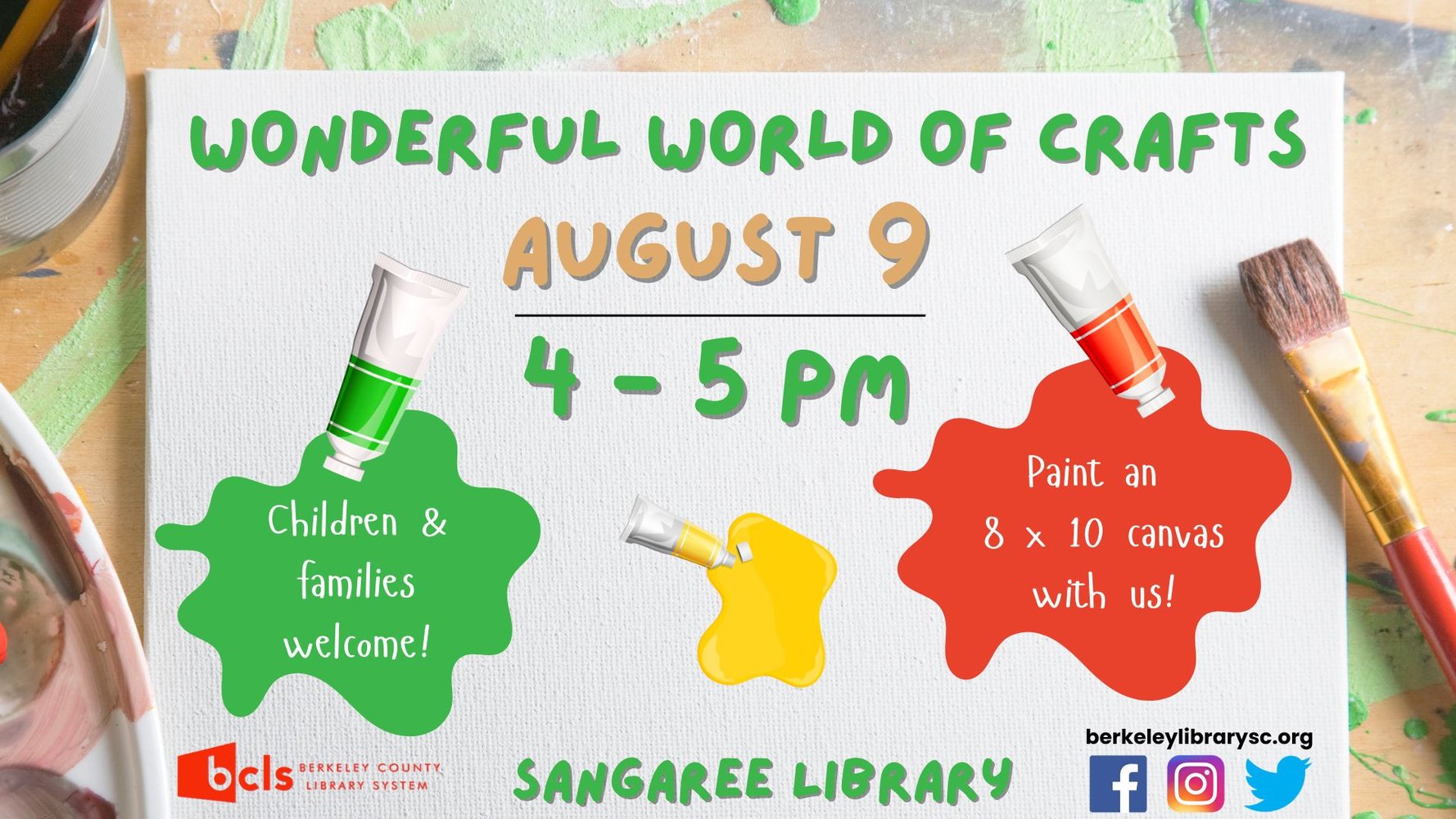 Berkeley County Library System (BCLS) is hosting a monthly Wonderful World of Crafts, Wednesday, August 9th, 2023, from 4 pm to 5 pm at Sangaree Library, located at 595 Sangaree Parkway, Summerville. Customers will be painting on an 8 x 10 art canvas. Sangaree Library is proud to give customers a safe, comfortable space to explore creativity!