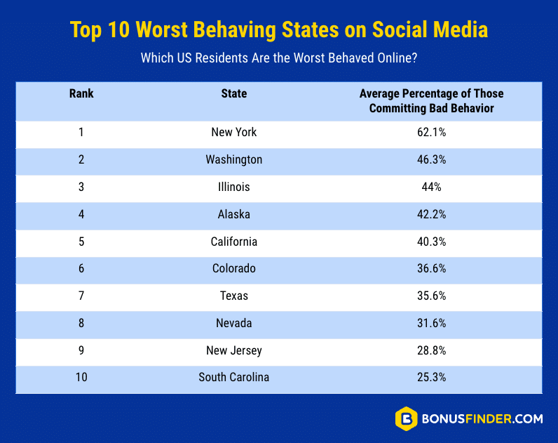 - New York is the worst behaving state on social media with nearly two in three (62.1%) of residents committing bad behavior online