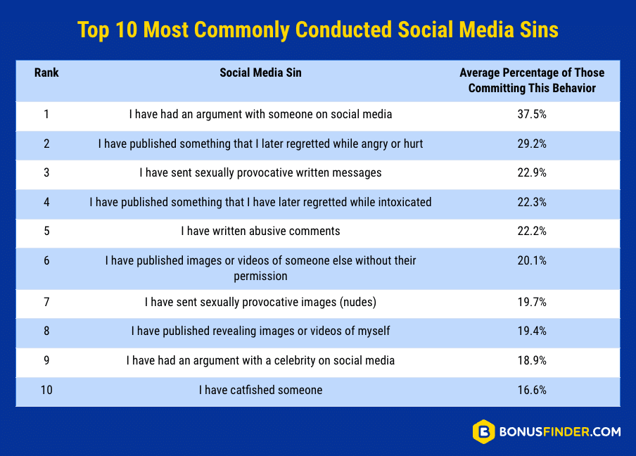 - America’s most commonly conducted bad behavior included arguing with others (37.7%), publishing regrettable content while angry (29.2%) and sending sexually provocative messages (22.9%)