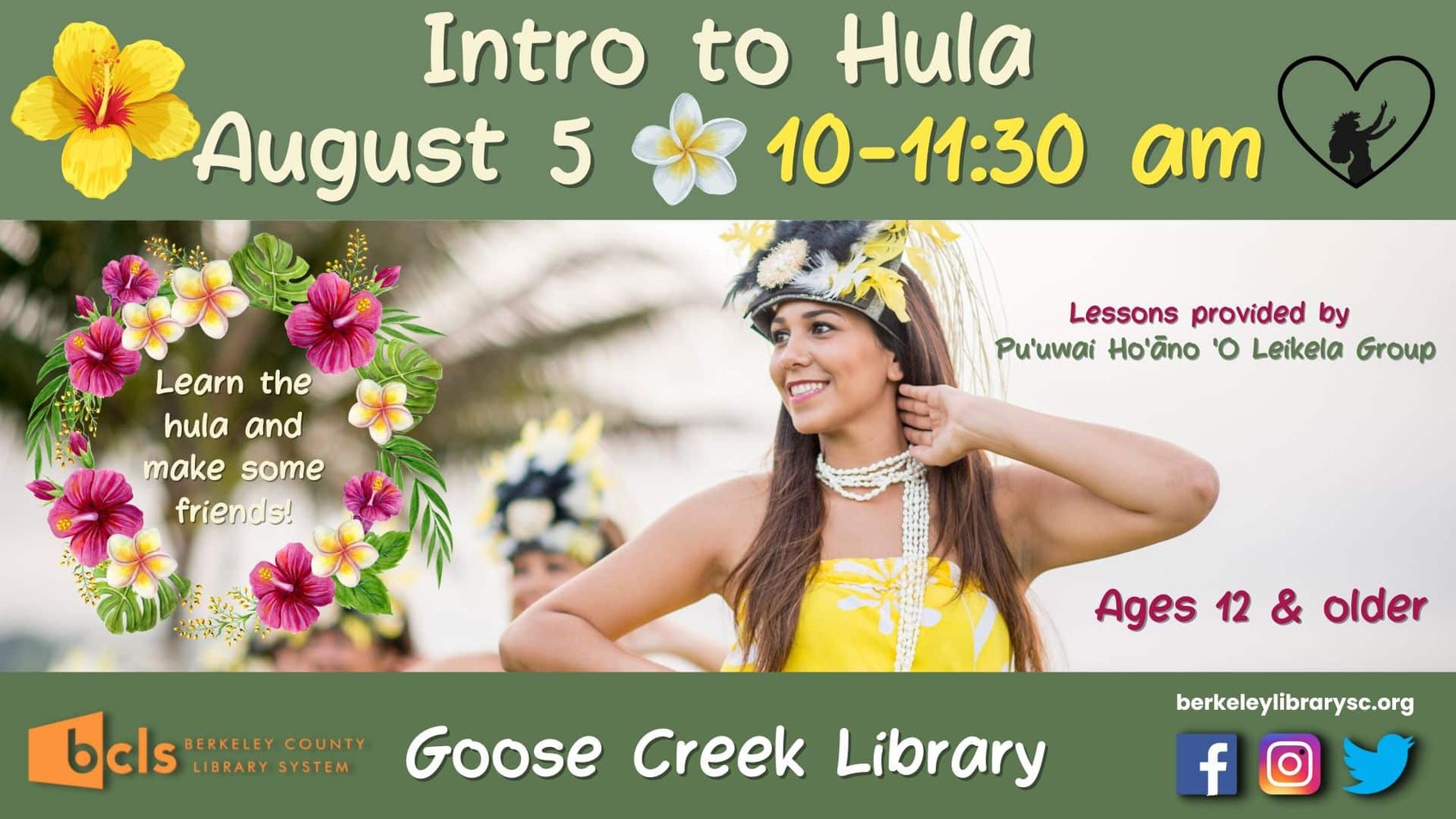 Berkeley County Library System (BCLS) invites ages 12 and older to experience Hawai’ian culture and dance with Intro to Hula Class on Saturday, August 5th, 2023 from 10 am to 11:30 am at Goose Creek Library located at 325 Old Moncks Corner Road, Goose Creek. Customers will learn about the Hawai’ian culture and history, hula dance, have fun, and perform! Shantel Rasure is the current head instructor, and a member of Pu’uwai Ho’āno ‘O Leikela Group, a hula group, in the Charleston area. She is from Hawai’i, speaks Hawai’ian, and has been dancing many different styles during her lifetime.