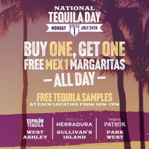 To celebrate National Tequila Day (Monday, June 24th), all Mex 1 Coastal Cantina locations will be offering BOGO Mex 1 Margaritas (only the Mex 1 Marg is on the BOGO deal).