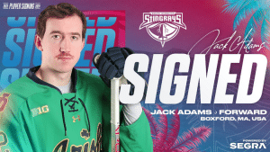 The Boxford, MA native played five seasons of Division I college hockey and registered 64 points in 142 games. The 6’6″, 216-pound forward most recently played for the Notre Dame Fighting Irish for the past two seasons and tallied 29 points in 70 games. Adams will now begin his professional hockey career in North Charleston.”I am so excited to get started, and it was a no-brainer for me,” Adams said of his decision to join the Stingrays. “I have a lot of friends that have played in the Stingrays organization, and they’ve all fallen in love with it. There’s a lot of great guys to learn from that have won there and have had success, and I’m excited to work with those guys,” he added.