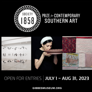 The Gibbes Museum of Art is pleased to announce the 2023 1858 Prize for Contemporary Southern Art. Each year, Society 1858, the museum’s young professionals auxiliary group, awards a $10,000 cash prize to one artist whose work demonstrates the highest level of artistic achievement in any media, while contributing to a new understanding of art in the South. Past winners include Raheleh Filsoofi (2022), Stephanie J. Woods (2021), Stephen L. Hayes (2020), Donté K. Hayes (2019), Leo Twiggs (2018), Bo Bartlett (2017), Alicia Henry (2016), Deborah Luster (2015), Sonya Clark (2014), John Westmark (2012), Patrick Dougherty (2011) and Radcliffe Bailey (2010). Submissions for 2023 will be accepted online at www.1858prize.org through August 31st, 2023.