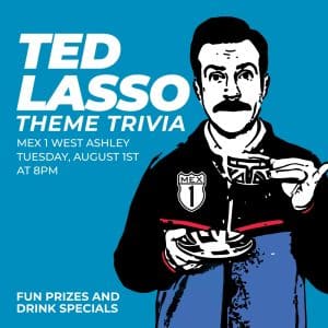 On Tuesday, August 1st, Mex 1 Coastal Cantina’s West Ashley location will host Ted Lasso-themed trivia starting at 8 pm.