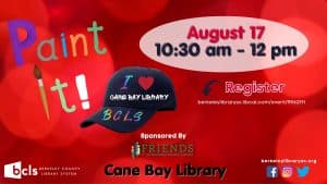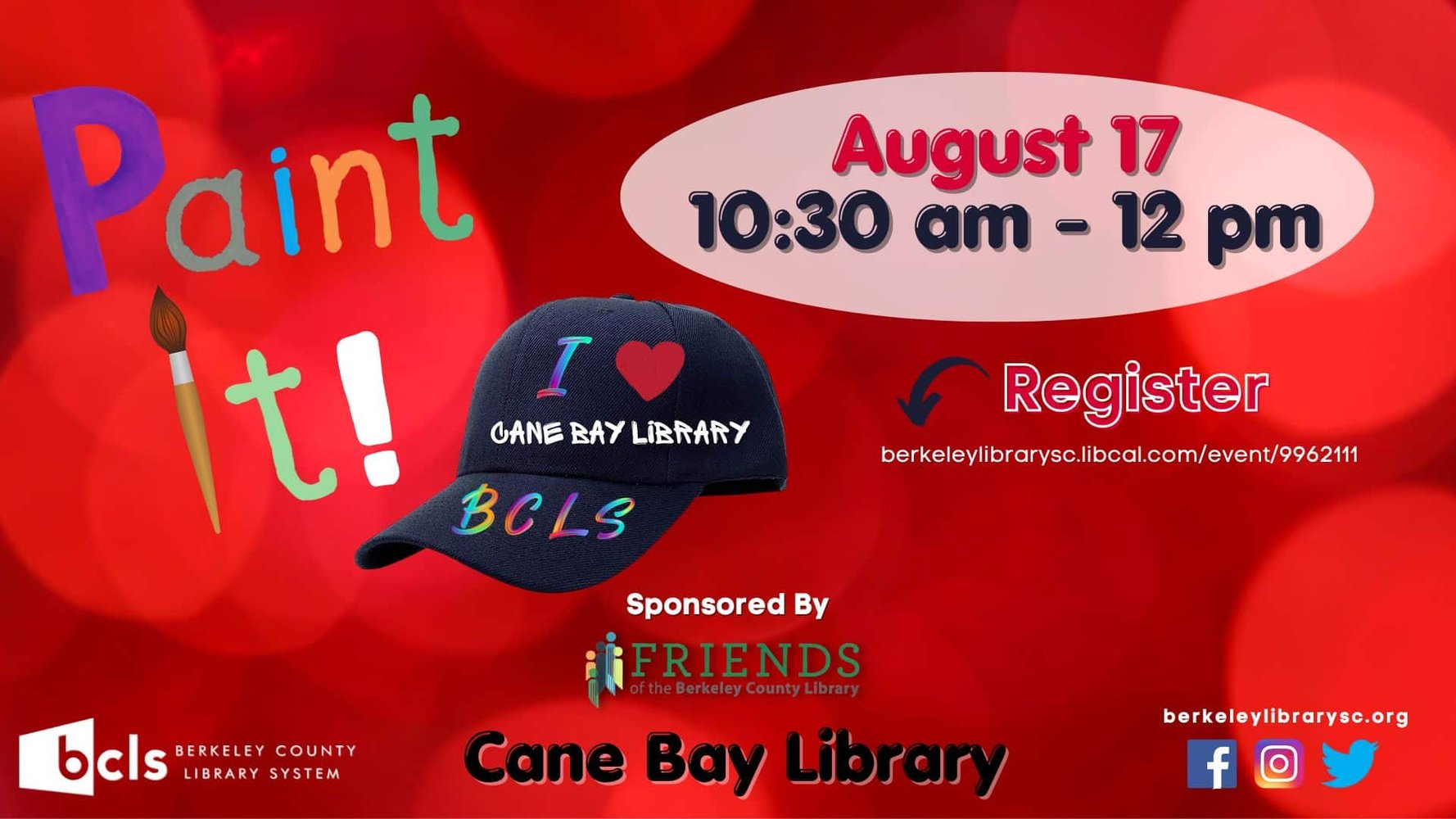 Berkeley County Library System (BCLS) will provide a Paint It! activity on Thursday, August 1th, from 10:30 am to 12 pm and will continue once a month at Cane Bay Library, located at 1655 Cane Bay Boulevard in Summerville. You can register at berkeleylibrarysc.libcal.com/event/9962111 or call 843-719-4796.