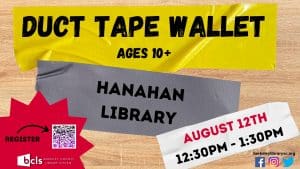 Berkeley County Library System (BCLS) is hosting Duct Tape Wallet for ages 10 and older to design their own duct tape wallet on Saturday, August 12th, from 12:30 pm to 1:30 pm at Hanahan Library, located at 1216 Old Murray Court, Hanahan. You can register at berkeleylibrarysc.libcal.com/event/10969749.