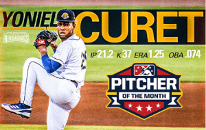 Curet went 2-0 with a 1.25 ERA in five games (four starts), allowing three earned runs over 21.2 innings. The opponent mustered just five hits over the five appearances. He led Minor League Baseball in batting average against (.074) and was the only pitcher in the minors with more than 21.0 innings pitched to allow fewer than 10 hits. His 37 strikeouts led the league and in his final start of the month (July 28), he set a career-high by striking out 11 of the 13 batters he retired against Augusta.
