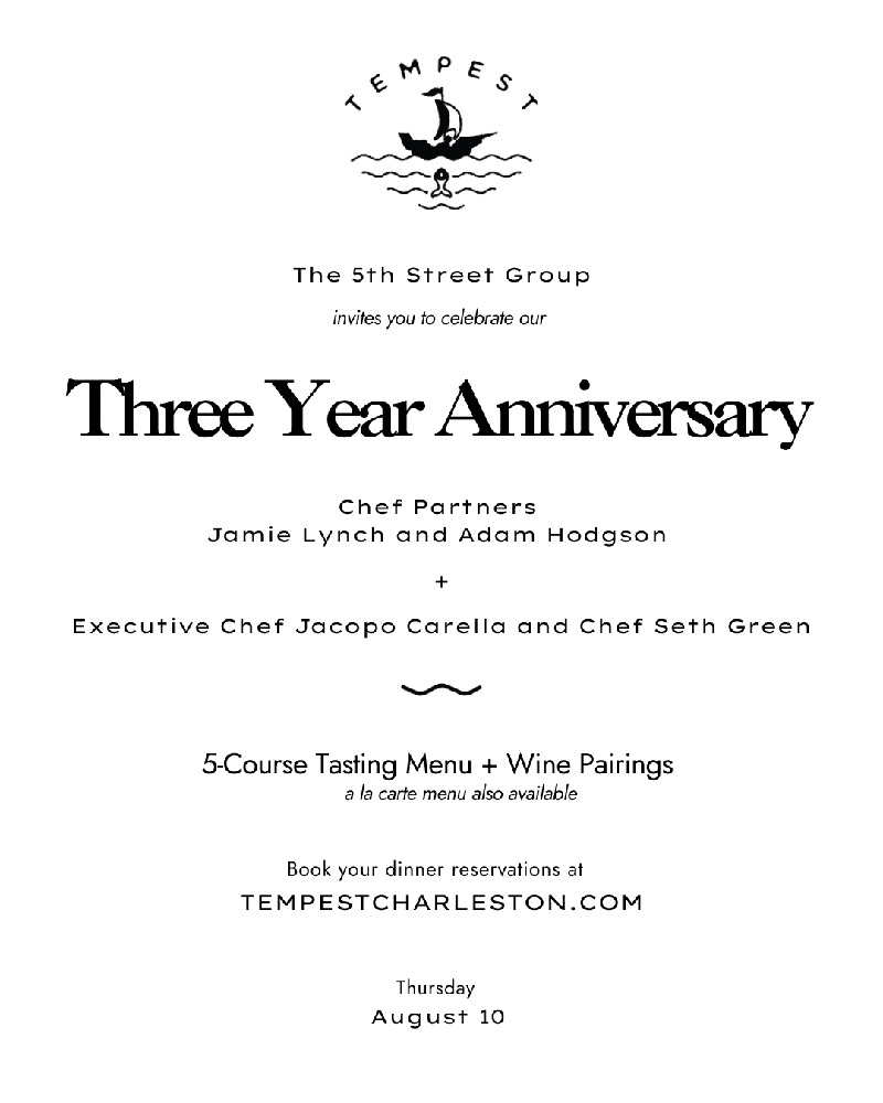 Tempest will host their Three-Year Anniversary Dinner beginning at 5 pm on Thursday, August 10th. They will be offering a special 5-course chef tasting menu in addition to their regular a la carte menu.