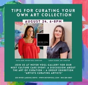 Join Meyer Vogl Gallery for their next “Culture Cake” event, a series of arts and cultural programming at their Daniel Island location. The event will take place on Thursday, August 24th, from 6 pm to 8 pm, at 250 River Landing Drive.