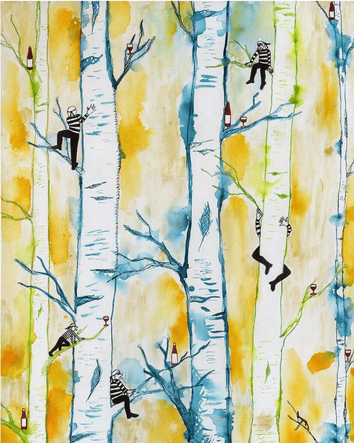 Tamara Garvey is a fine artist and illustrator based out of Savannah, Georgia. She creates whimsical, cheerful artwork that frequently incorporates trees, “as they’re so fun to depict with pen-and-ink. Birch trees in particular are full of textures and quirks, and endless varieties of shapes, so I never get tired of painting them”. The Burglar pieces shown with this exhibition are part of a whole series of “old-timey burglars hightailing it up birch trees with their stolen loot” – there is a different whimsical, absurd object in each painting. Garvey graduated from SCAD (Savannah College of Art & Design) in 2008 with a B.F.A. in illustration, and after 7 years in NYC, now works as a full-time artist in Savannah. She’s proud to have been awarded 1st Place Mixed Media at the Society of Bluffton Artists in Bluffton, SC, in their 2021 Judged Show. And most recently, was voted Best Local Visual Artist in Connect Savannah’s “Best Of” Contest for 2023! Garvey has shown with the Grand Bohemian Gallery in Charleston since 2021.