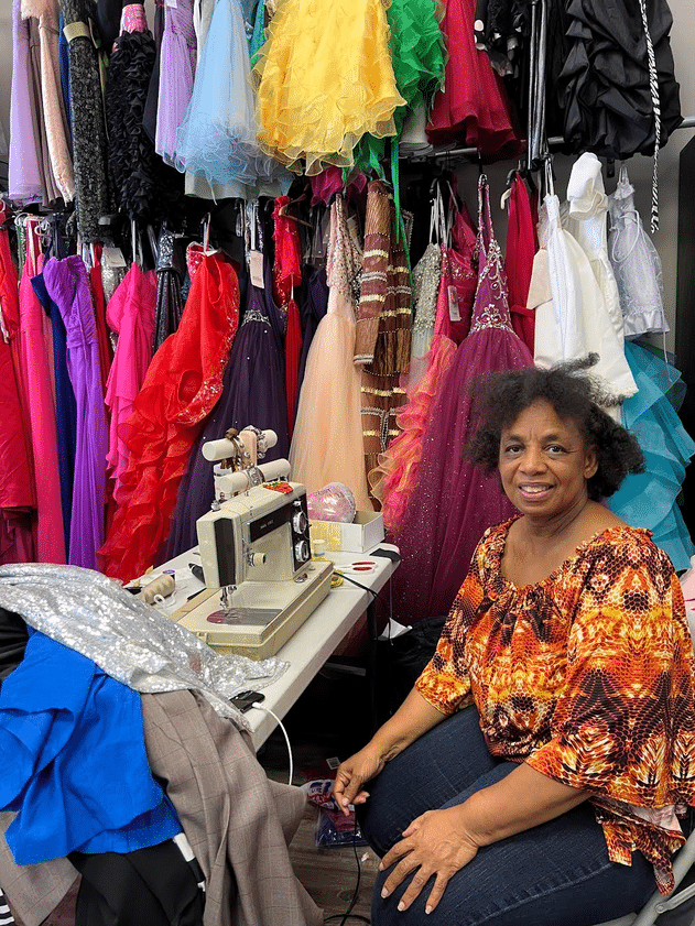 Sheila loves being a seamstress and she enthusiastically embraces challenges. Teenage girls thrilled about going to their first prom or for their quinceanera, women shopping for their wedding day and others finding just the right mother of the bride gown. The customers have purchased and carried away their beautiful gowns and then sent Sheila photos of how marvelous they looked and felt at their special occasion. Sheila is thrilled to have, in a way, been part of the event.