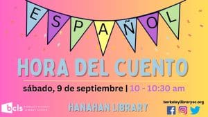 El sistema de bibliotecas del Condado de Berkeley (BCLS) y la biblioteca de Hanahan invitan a los niños menores de 5 años* a participar de LA HORA DE CUENTO EN ESPAÑOL el sábado 9 de septiembre de 2023 de 10:00 a.m. a 10:30 a.m. La narración de los cuentos en español, incluyendo cantos y otras actividades de entretenimiento, estará a cargo de voluntarios.