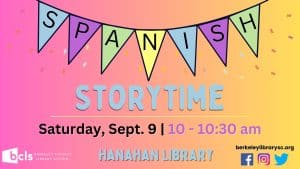 For more information on Spanish Storytime or other BCLS events/programs at the Hanahan Library, contact Kirstin Steele at 843-553-0047 or kirstin.steele@berkeleycountysc.gov.