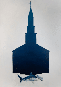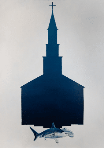 In Sanctuary, Kevin Morrisey presents a series of acrylic and mixed media paintings that depict animals juxtaposed over large flat silhouettes of architectural structures set within atmospheric color fields and environments. Creating both tension and harmony, the imagery explores how environment and experiences influence our understanding of identity, both our own and of others. The works in this series intend to express the conflict in coexisting dualities of faith and doubt, free will and predestination, wealth and wisdom, sin and salvation, and the durability of grace. “These things are not mutually exclusive, separate, or necessarily antagonistic of each other. Rather, they often exist together, simultaneously in the same event, our understandings, and our responses to life events,” Morrissey explains. While each artwork has specific inspirations behind them, they are not easily summarized. The viewer is encouraged to read, reflect, and discuss these works with those around them. “The end goal is to hopefully create a piece in which viewers see a little bit of themselves and others in the animals,” Morrisey says.