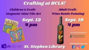 “St. Stephen Library welcomes you to craft with us! Our kids craft will be making magnetic mini-tile art and our adult craft will be painting a fall theme on a wine bottle! Join us.”