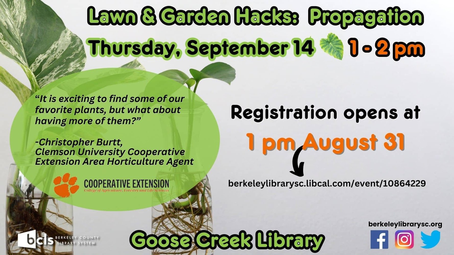 Berkeley County Library System (BCLS) will co-host Lawn & Garden Hacks: Propagation with Christopher Burtt, Clemson University Cooperative Extension Area Horticulture Agent, for Berkeley, Charleston and Dorchester Counties, on Thursday, September 14th, 2023 from 1 pm to 2 pm. The event will take place at Goose Creek Library, located at 325 Old Moncks Corner Rd., Goose Creek. Please register at berkeleylibrarysc.libcal.com/event/10864229. Registration opens at 1 pm on August 31st.