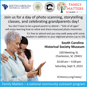 Attention grandparents! Join the South Carolina Historical Society on Saturday, September 9th for a Grandparent’s Day event at the Fireproof Building. You can learn about preserving your family’s history with the South Carolina Historical Society, Vivid-Pix, and the Charleston Chapter of the South Carolina Genealogical Society.