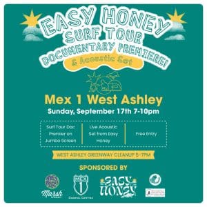 Mex 1 Coastal Cantina in West Ashley will host the premiere screening of Easy Honey’s surf documentary on Sunday, September 17th, from 7 pm to 10 pm. The free event will also include a live performance by the local band.