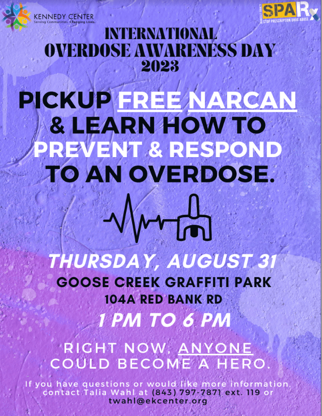 The Kennedy Center Prevention Department, along with its SAMHSA-awarded grant, Partnership for Success (PFS), will be observing International Overdose Awareness Day (IOAD) on August 31st, 2023 by sponsoring a Free Narcan Distribution Event from 1 pm to 6 pm at the Goose Creek Graffiti Park (104A Red Bank Road). Deterra pouches to dispose of unused medications will also be provided at the event, as well as community resource information on overdose prevention, and available treatment and support services.
