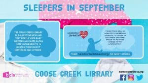 Berkeley County Library System (BCLS) will co-host Sleepers in September throughout September and October with the Charleston SC Chapter of Newborns In Need organization. Goose Creek Library, located at 325 Old Moncks Corner Road, Goose Creek, will be a drop-off location for the very-gently used, new baby sleepers, and sleep sacks (sizes newborn to 18 months).