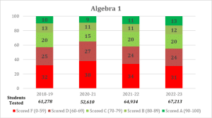 The mean score for Algebra 1 increased from 68.12 in 2022 to 69.12 in 2023, surpassing the pre-pandemic mean score of 68.34 in 2019.