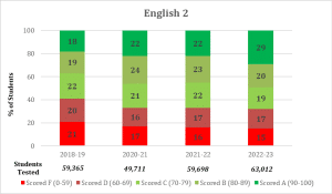 English 2 mean scores jumped to 77.65 in 2023 from 76.52 in 2022.