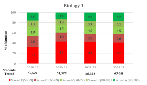 Biology 1 and U.S. History means scores also increased in 2022 but remained lower than in 2019.