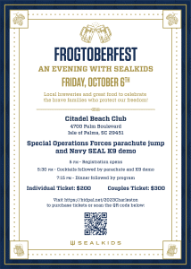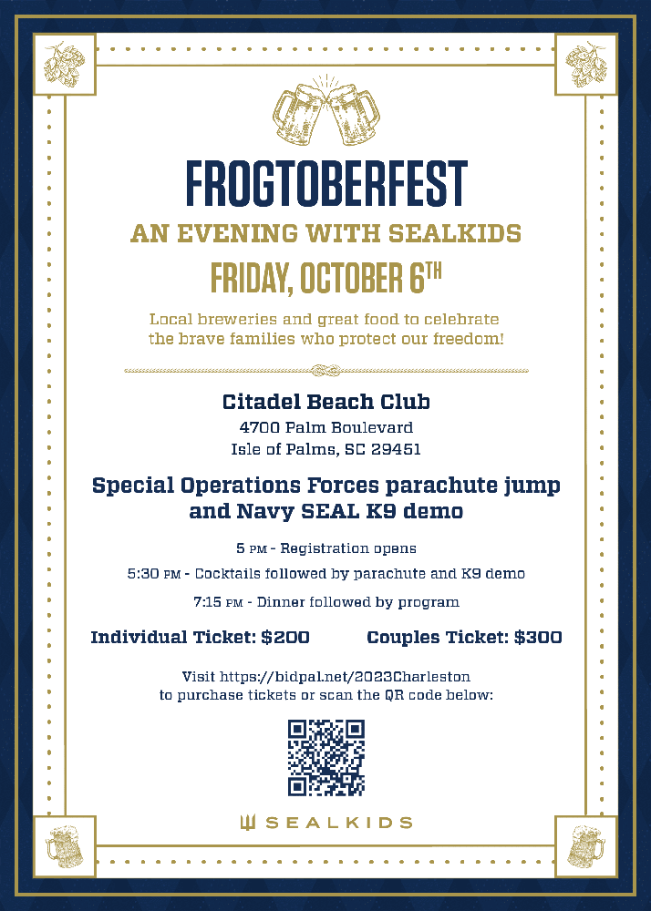 SEALKIDS, an organization that helps serve active duty and veteran Navy SEAL families through academic support and tutoring, will host FROGtoberfest, an annual fundraiser and auction, on Friday, October 6th, from 5 pm to 9 pm. The event will be held at The Citadel Beach Club on Isle of Palms (4700 Palm Boulevard).
