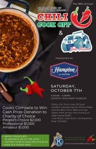 The 38th Annual Kiwanis Club of Hilton Head Island Chili Cook Off & Jeep Island Presented by Hampton by Hilton will take place from 11 am to 3:30 pm on Saturday, Oct. 7th, at Coastal Discovery Museum. The event raises much-needed funding for local youth charities.
