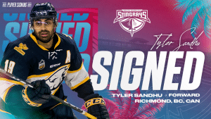 The South Carolina Stingrays, ECHL affiliate of the NHL’s Washington Capitals and AHL’s Hershey Bears, have signed forward Tyler Sandhu to an ECHL contract for the 2023-24 season.