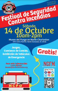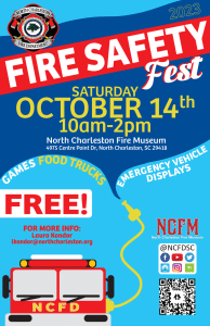 In celebration of Fire Prevention Week 2023, North Charleston Fire Department will be hosting an event, “Fire Safety Fest”, on Saturday, October 14th from 10 am to 2 pm at the North Charleston Fire Museum (4975 Centre Point Dr, North Charleston, SC 29418). We are inviting our community to enjoy apparatus displays from multiple agencies, a children’s section, educational booths, live demonstrations, FREE admission to the fire museum, food trucks, and great entertainment! Visit the event link for more information: https://fb.me/e/1tWmPmBS6
