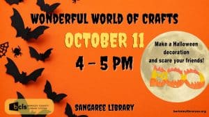 Berkeley County Library System (BCLS) is hosting a monthly Wonderful World of Crafts, Wednesday, October 11, 2023, from 4 – 5 pm at Sangaree Library, located at 595 Sangaree Parkway, Summerville. Customers will be creating wooden Halloween decorations just in time for Halloween! Sangaree Library is proud to give customers a safe, comfortable space to explore creativity!