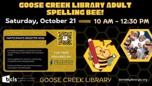 Berkeley County Library System (BCLS), announced the first Goose Creek Library Adult Spelling Bee. The event will take place on Saturday, October 21st, 2023 from 10 am to 12:30 pm at the Goose Creek Library located at 325 Old Moncks Corner Road.