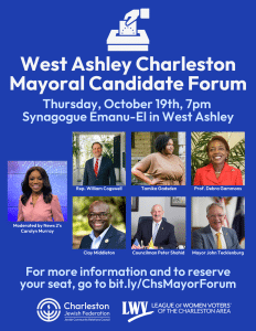 The Charleston Jewish Federation and the League of Women Voters Charleston have partnered to offer a Mayoral Candidate Forum to the West Ashley community on Thursday, October 19th at 7 pm. All six Charleston mayoral candidates are confirmed as attending.