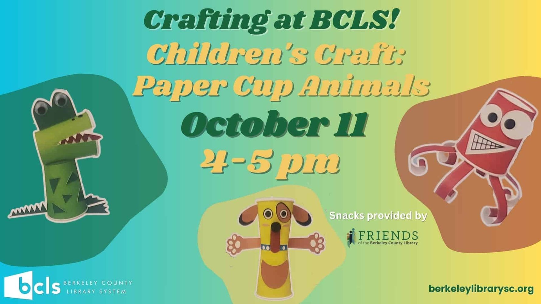 Berkeley County Library System (BCLS), is hosting Children’s Craft: Paper Cup Animals, October 11, 2023 from 4 pm to 5 pm. Children, ages 5 and up, will make silly animals with paper cups. Snacks and supplies provided by Friends of the Berkeley County Library.