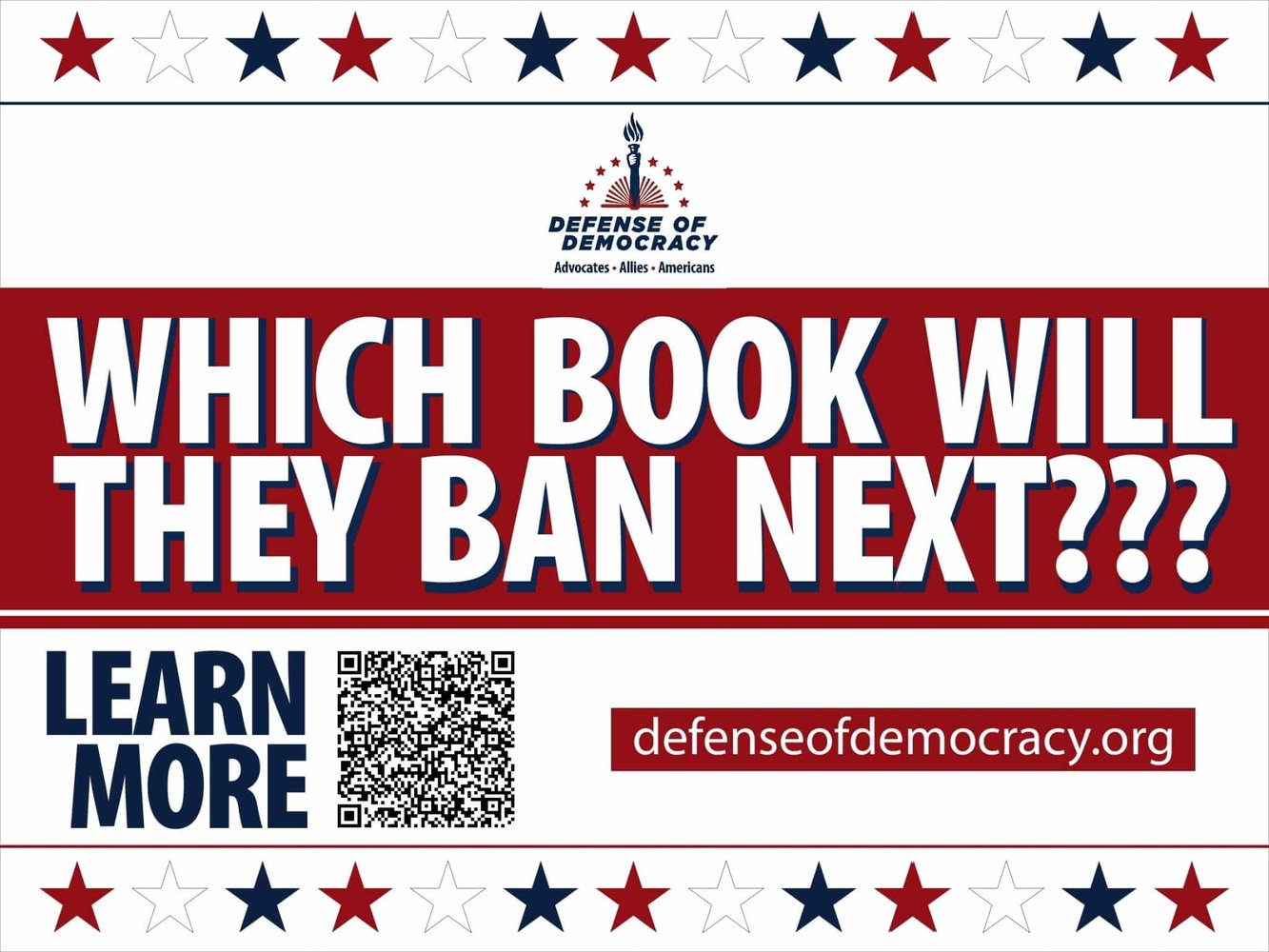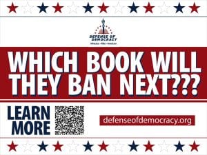 When students follow the QR code on the sign, they’ll see information about book bans and be able to sign up at Defense of Democracy to get notifications to take action.