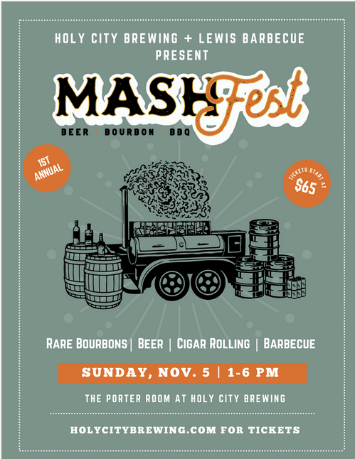 The teams behind two popular Lowcountry establishments, Holy City Brewing and Lewis Barbecue, are partnering to host the first annual MashFest, a daylong event featuring beer, barbecue, bourbon, and live music from The Letter Show, on Sunday, November 5th, from 1 pm to 6 pm. The event will be held at The Porter Room at Holy City Brewing, 1021 Aragon Ave. in North Charleston.