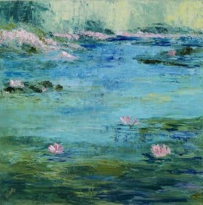 Similar to famous artist Claude Monet, but with her own contemporary twist, artist Trish Weeks emulates the master with her own version of his beloved water lilies titled “Thinking of Monet #4”, that is the signature piece in her upcoming show “MEMORIES” at Mary Martin Gallery in Charleston.