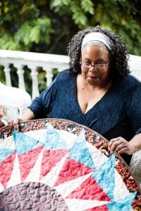 Torreah “Cookie” Washington is an award-winning fourth generation needle worker and curator. Born in Rabat, Morocco, she has traveled extensively, and has made her home for the last 33 years in Charleston, SC. For 16 of those years, she has served as the guest curator of the Annual African American Fiber Art Exhibit presented as a component of the North Charleston Arts Fest. Her work has been exhibited in numerous solo and group exhibitions locally, nationally, and abroad. In addition, she has been featured in documentary films about African American Art Quilters, including “The Wayshowers,” which she shared executive producer credit on, and “Skin Quilt” by Lauren Cross. One of her proudest accomplishments to date is being selected as one of 44 Master Art Quilters to create a quilt to honor President Barak Obama’s Inauguration in 2009. In addition to curating and maintaining her studio practice, Cookie teaches “quilt as you go” classes to women in underserved communities, gives educational lectures for students in public schools, and donates quilts to charities serving the homeless. Learn more about the artist at cookiesewsquilts.com.