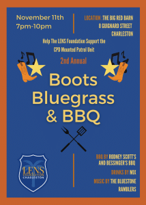 The LENS Foundation will host their 2nd Annual Boots, Bluegrass & BBQ on Saturday, November 11th at 7 pm. The event will be held at The Big Red Barn at 8 Guignard Street in downtown Charleston.