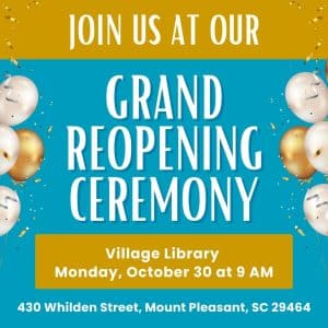The Charleston County Public Library (CCPL) will open the renovated Village Library, located at 430 Whilden St in Mount Pleasant, on Monday, October 30th. The public is invited to attend a ribbon cutting ceremony beginning at 9 am at the branch.