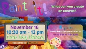 BCLS is pleased to provide customers with the opportunity to relieve stress and create in a comfortable space. November’s project will be painting on a canvas board. Paint It! is not a painting class but rather an opportunity for free expression. All supplies provided by Friends of the Berkeley County Library.