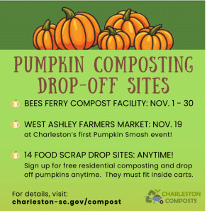 - Drop-off at Bees Ferry Compost Facility: In partnership with Charleston County, from November 1 until 30, 2023, a special clean pumpkin collection bin will be available near the food scrap carts at the Bees Ferry Compost Facility, located at 1344 Bees Ferry Road. The facility’s hours of operation are Monday to Friday from 8 a.m. to 4 p.m. and Saturday from 8 a.m. to 3 p.m.