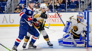 First-year Stingray Patrick Harper opened the scoring 6:50 into the game. Josh Wilkins skated past the top of the right circle and fired a turnaround shot toward the net. Harper tipped the puck in for his first goal of the 2023-24 season and his first goal as a Stingray. Michael Kim made it 2-0 when he beat Newfoundland goaltender Vyacheslav Peksa with a quick shot from the slot. 17:06 into the first, Jarid Lukosevicius wired one off the post and in to put the Stingrays up 3-0.