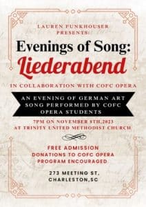 Lauren Funkhouser, a College of Charleston Opera singer and member of Trinity United Methodist Church’s Songbirds, will present a special concert of German art songs entitled “ Evenings of Song: Liederabend” at Trinity United Methodist Church at 7 pm on Wednesday, November 8th.